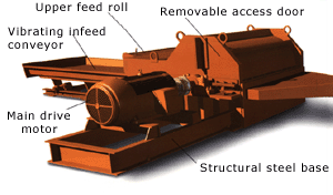 48" wide pallets are placed on the vibrating steel bed, nails and all, and