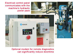With too little force, full grinding capacity is never achieved. With excessive force, the rotor can jam. The MP Series control system continuously monitors current and signals the ram to retract when a predetermined amperage level is exceeded. In addition, the hydraulic power pack features a variable speed control which allows the ram cycle to be set at the appropriate speed for the type of material being processed, for example hard or soft wood, dry or green, pallets, stumps, etc. A pressure relief valve enables the ram to pause during the forward stroke when heavy grinding is sensed. When the pressure reduces the ram resumes its forward movement, eliminating nuisance cycling and maximizing efficiency. The control system also "thinks" about protecting your equipment. If tramp metal finds its way into the grinder, the unit will be instructed to shut down after three auto-reverses within a preset time frame. This virtually eliminates the potential for damage to the grinding rotor. |